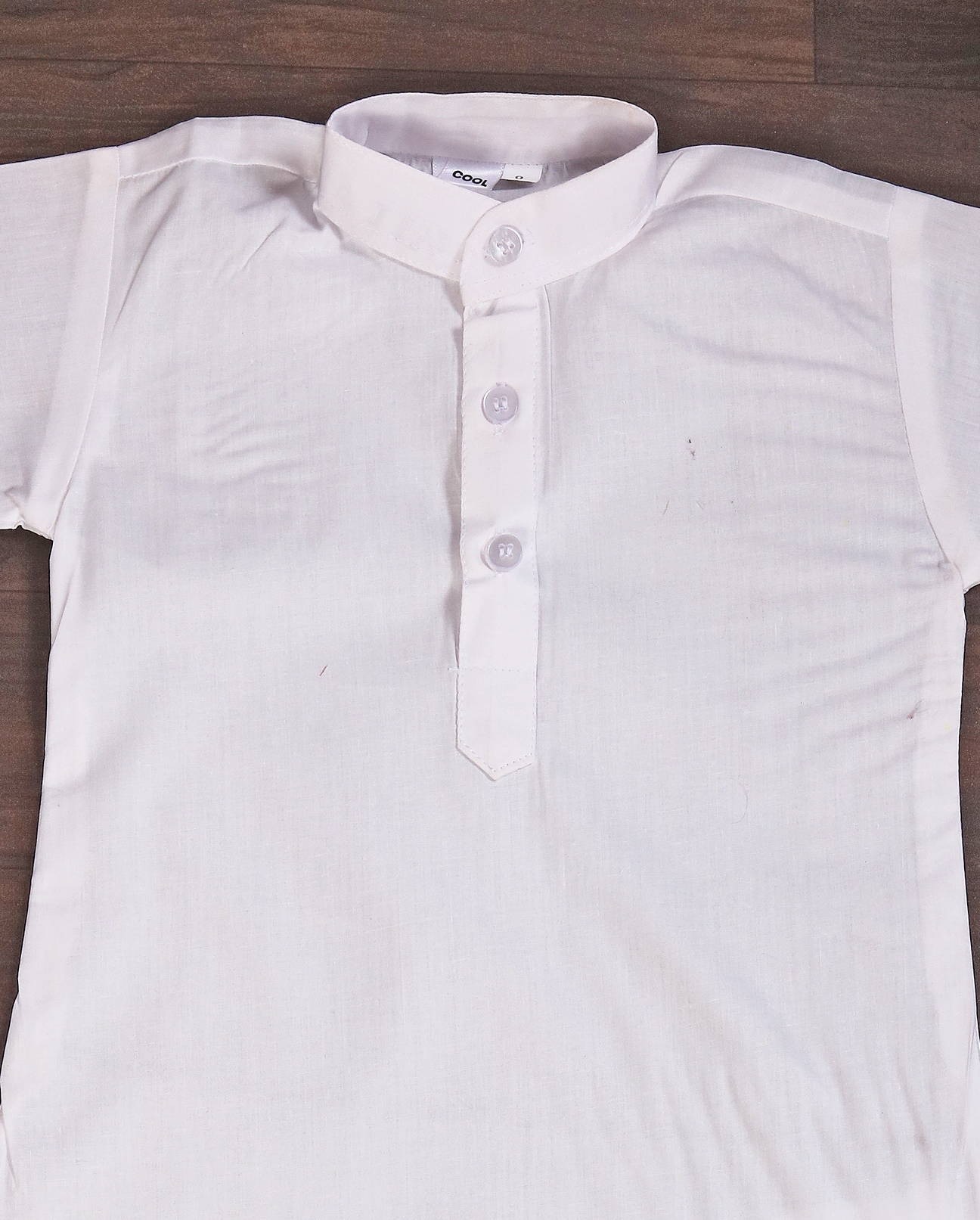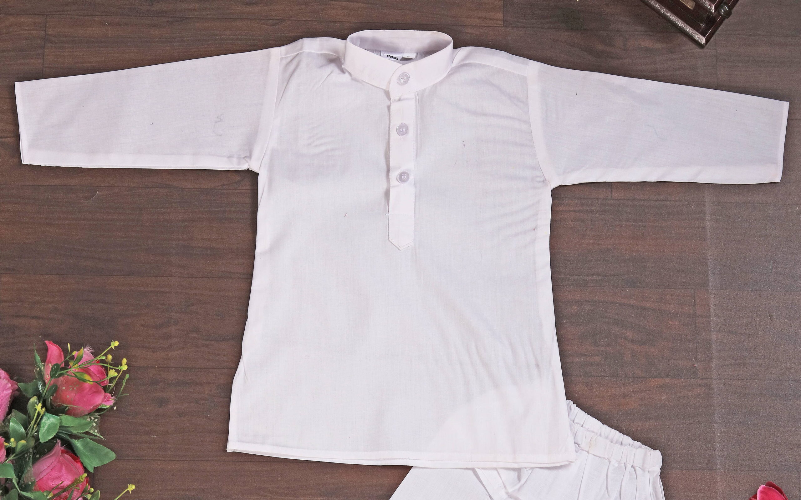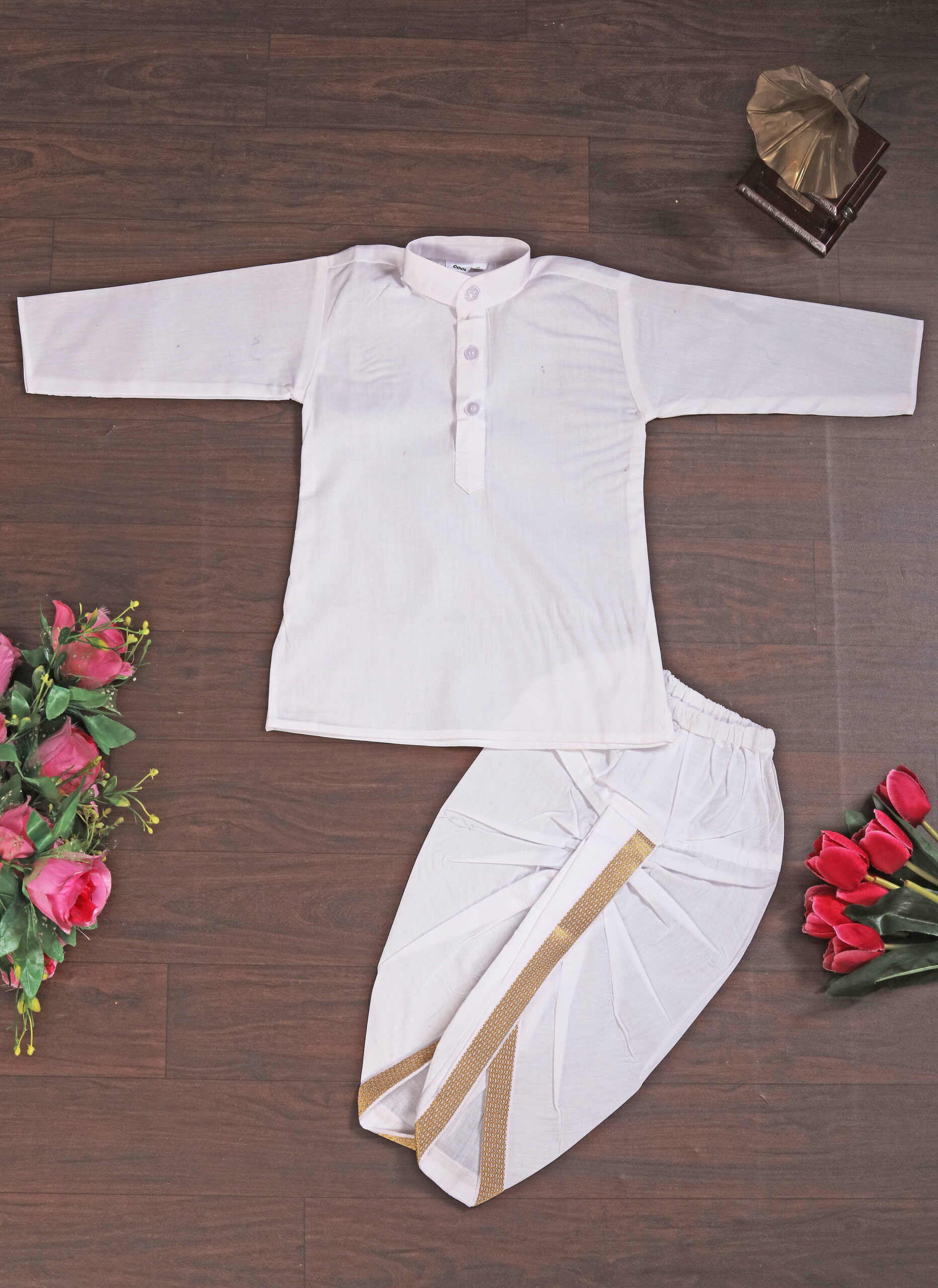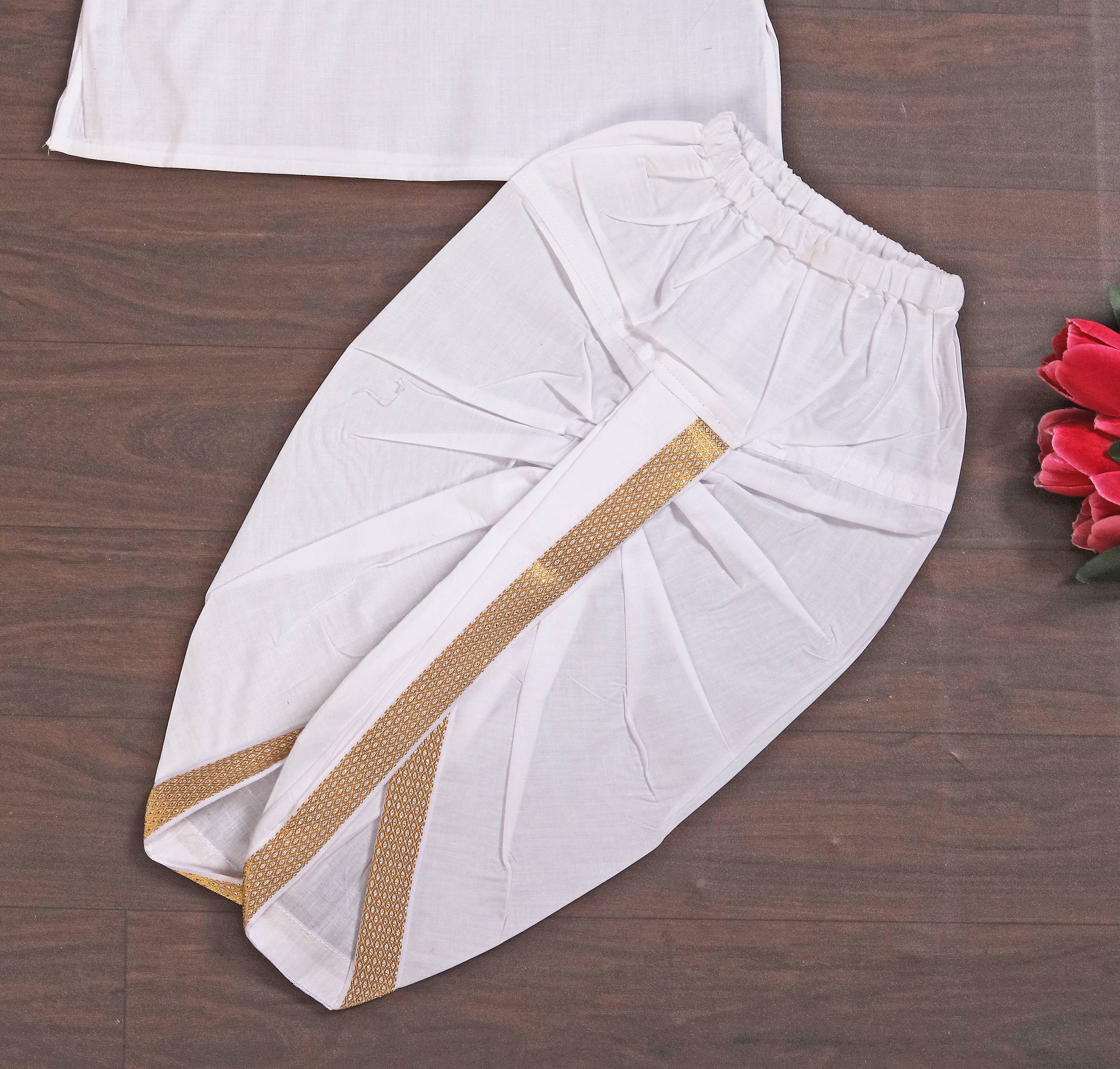 The set includes a classic white kurta featuring a mandarin collar and front button placket, paired with a beautifully designed dhoti with a golden border, adding a touch of festive charm. The elastic waistband ensures a secure yet flexible fit, allowing kids to move freely and play comfortably.